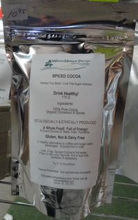 Processed at Orchard del Sol, All Natural, Nothing Added Nothing Taken Away. Rich in flavor and nutrients. Our process is simple. We roast and grind the bean without extraction of the cocoa butter. This is a whole food, mood elevating, rich in antioxidants and minerals. Use as a coffee substitute or an anytime pick me up. Cocoa is low in caffeine. As a whole food it carries natural properties that make it a great energy drink. We added the warm spices of cinnamon and cardamon to make our popular Spiced Cocoa (no sugar added). A great way to start your morning. 75g - $5.00 |